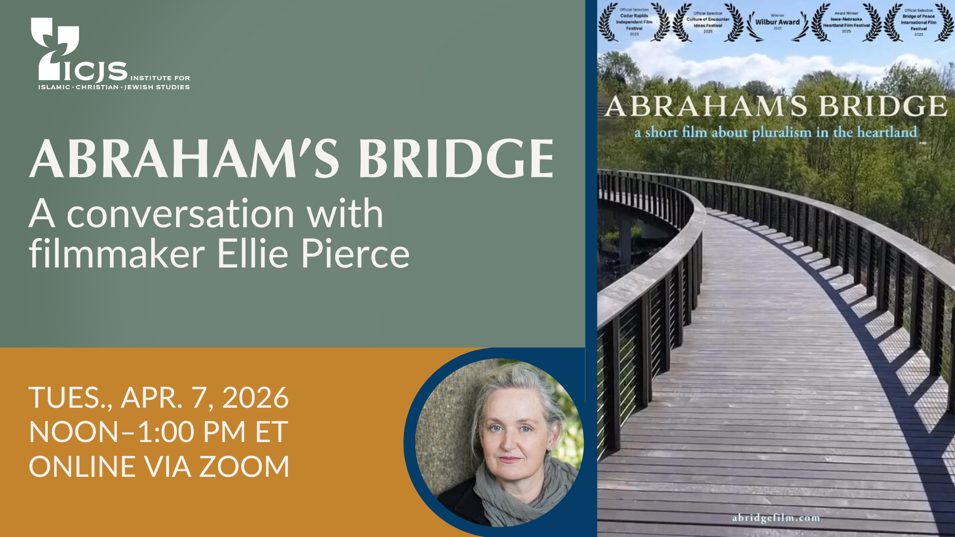 Elinor (Ellie) Pierce is a Boston-based filmmaker, writer, and humanities professional. Her multimedia work includes a Webby Award–winning website and the films Fremont, USA (2008), Autism: A Somali-American Story (2013), Les Deux (2019), and Abraham’s Bridge (2024), which she produced and directed. She is the author of Pluralism in Practice (Orbis, 2023) and co-editor of With the Best of Intentions and the festschrift Pilgrimage, Place, and Pluralism.