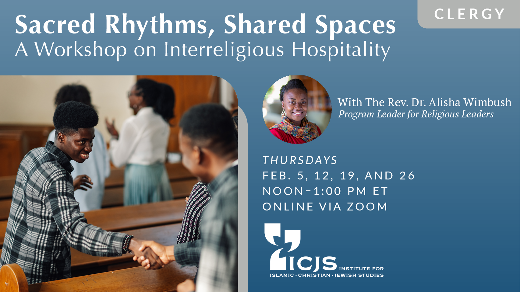 The Rev. Dr. Alisha Wimbush is the ICJS program director for religious leaders. Most recently Alisha served as an Associate Chaplain at a continuing care retirement community in Pennsylvania. She has more than 15 years of experience working and providing leadership in nonprofit and congregational settings. The Rev. Dr. has a B.A. in Social Work from Messiah College and is a graduate of Columbia Theological Seminary in Decatur, GA, where she earned both her M.Div. and a Th.D. in Pastoral Care and Counseling. She is passionate about building bridges across diverse communities and finding creative ways to foster relationships.